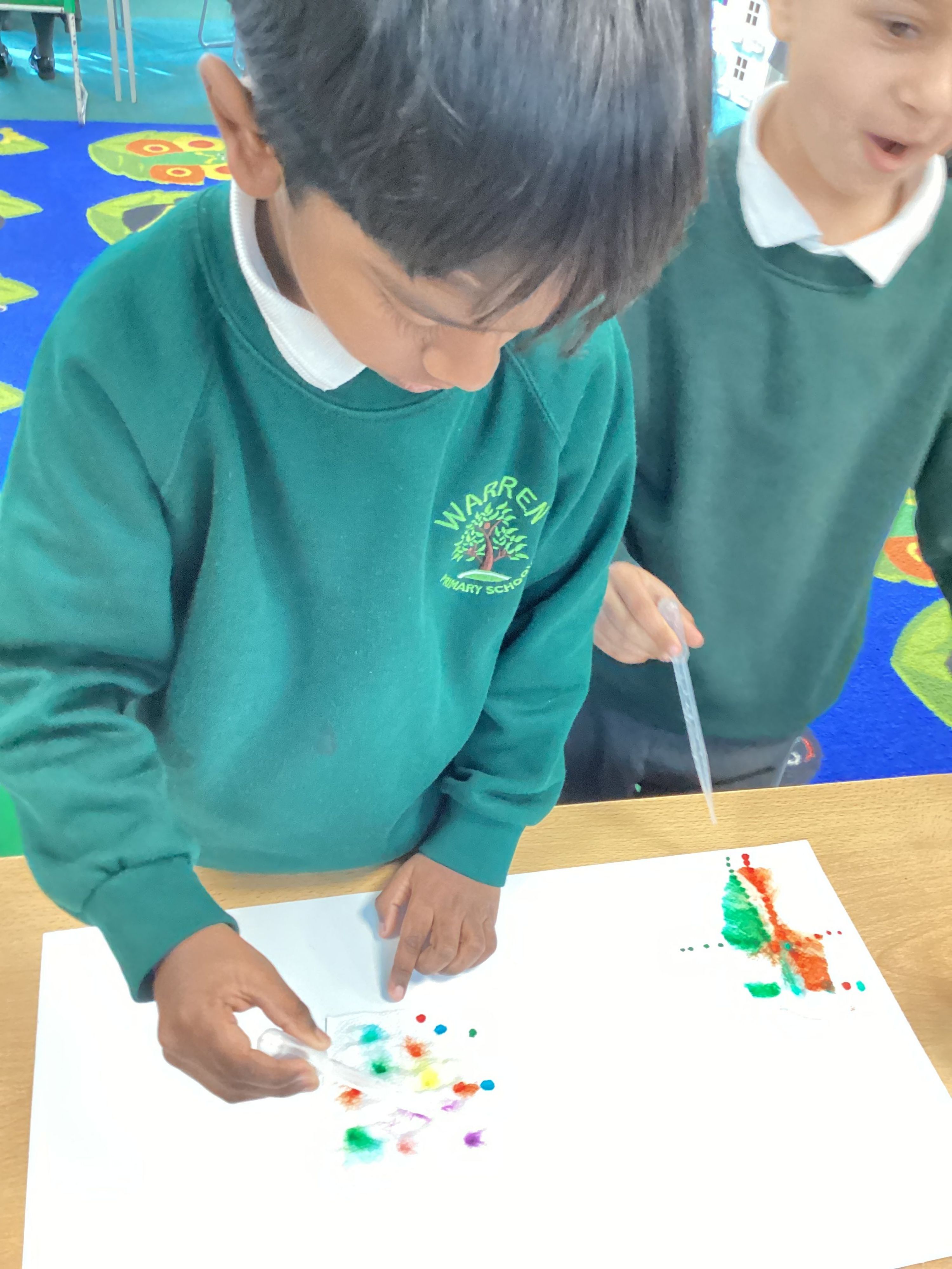 Year 1 were exploring simple chromatology using kitchen roll, water-based pens and pipettes. The children loved seeing the colours spread and change.
