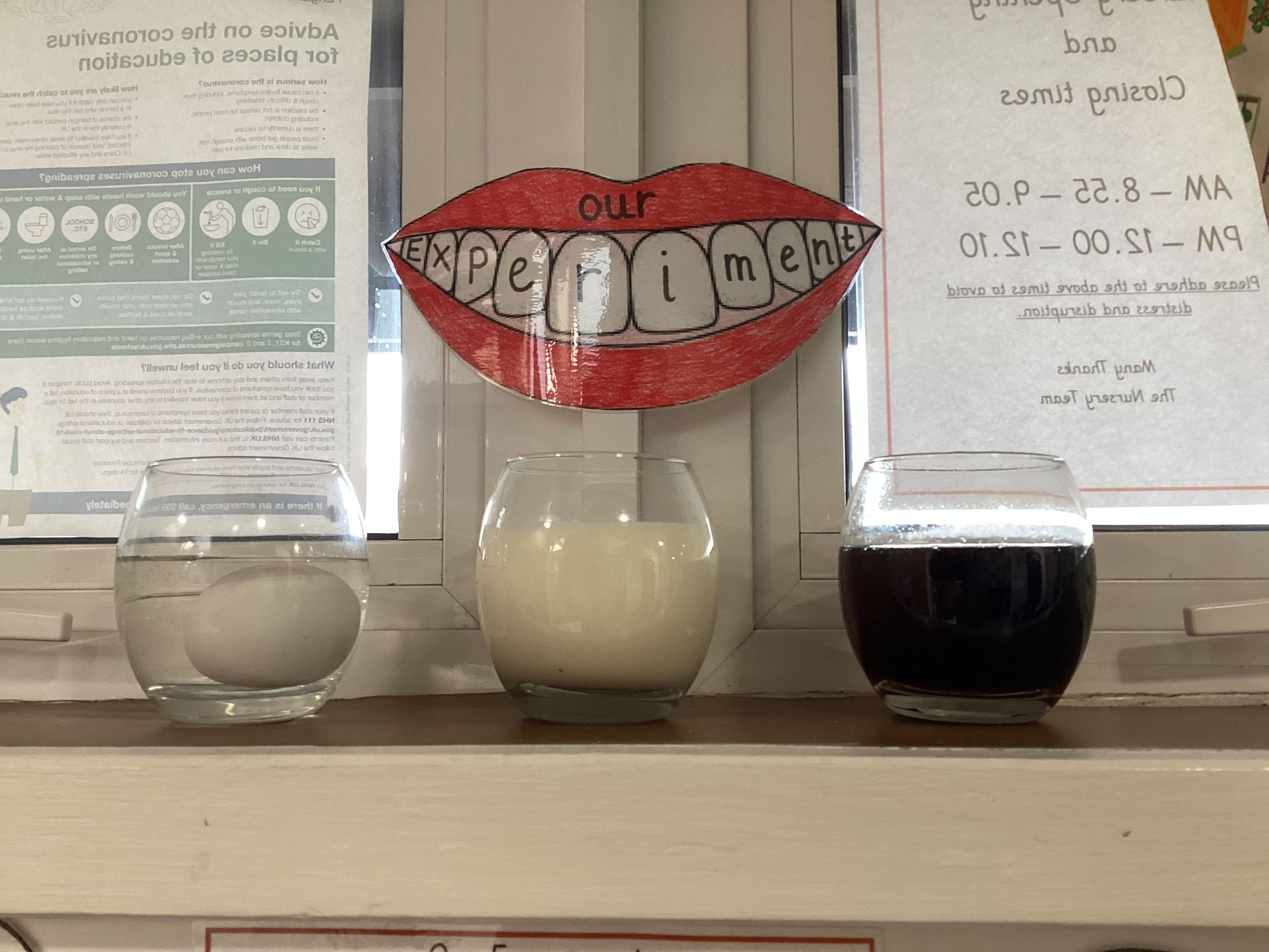 Nursery have been learning about good dental health and to demonstrate how different foods and drinks can affect our teeth they conducted an experiment. To replicate real teeth they used three hard-boiled eggs and placed each one into a different liquid - milk, water and Coca-Cola. The aim was to find out if any of the liquids would have an effect on the quality/colour of the egg shell.